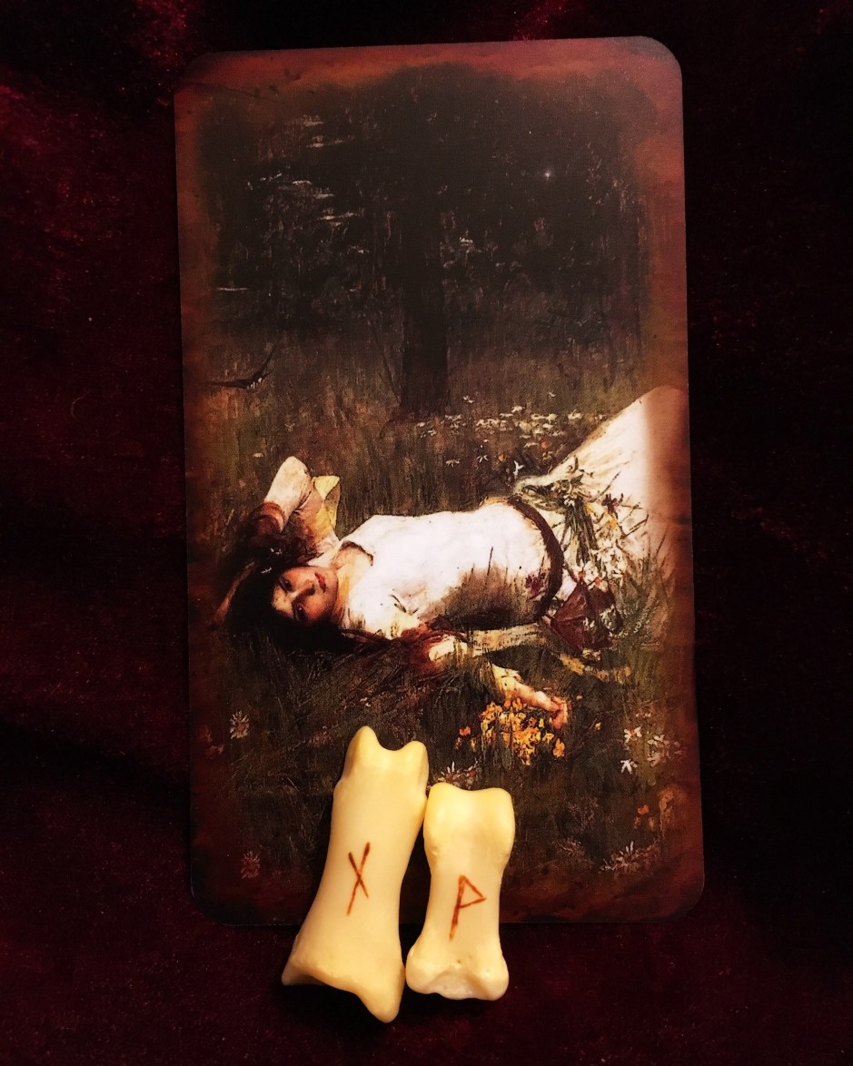 The top of the vanity has a folded white tablecloth from my parents’ wedding gifts. This cloth is a recent addition, about a year ago. Candles, a chalice of water, cornmeal, photos in frames (with an always empty slot – for future me), anointing oil, my blessings oil blend for the candles, and the brass container housing graveyard dirt (thanks Mum!) are some of the items. There are various other mementos spread about on top and in the drawers underneath. I periodically change out some of the mementos on top.