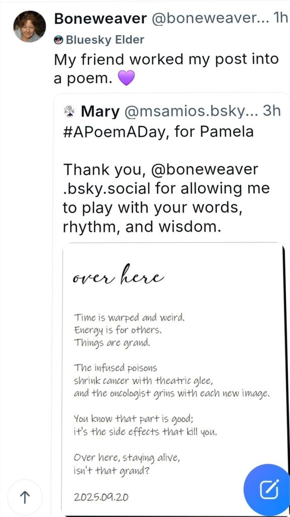 I made a short update post on Bluesky, photo 1. My friend asked if they could rework it into a poem, photo2.