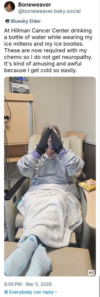 Received the immunotherapy med today. First infusion of each cycle I will get it. It lasts about 6 weeks. 80% dose today to watch for adverse reactions. So far none. I was given IV benadryl first because stupid mast cells (yes, I asked) and promptly fell asleep. Slept a half hour, I think. I’ve been woozy ever since.